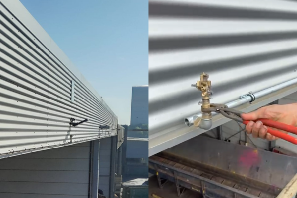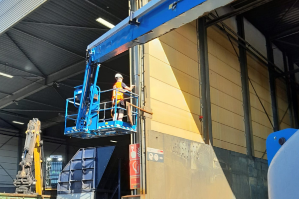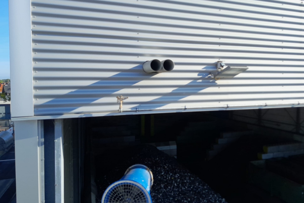 Om stofvorming tijdens het recyclingproces van elektronica te beperken, hebben we recent een praktische aanpassing doorgevoerd bij een recyclingbedrijf: de installatie van nieuwe sproeiers langs de rand van de loods om stofvorming tegen te gaan.
